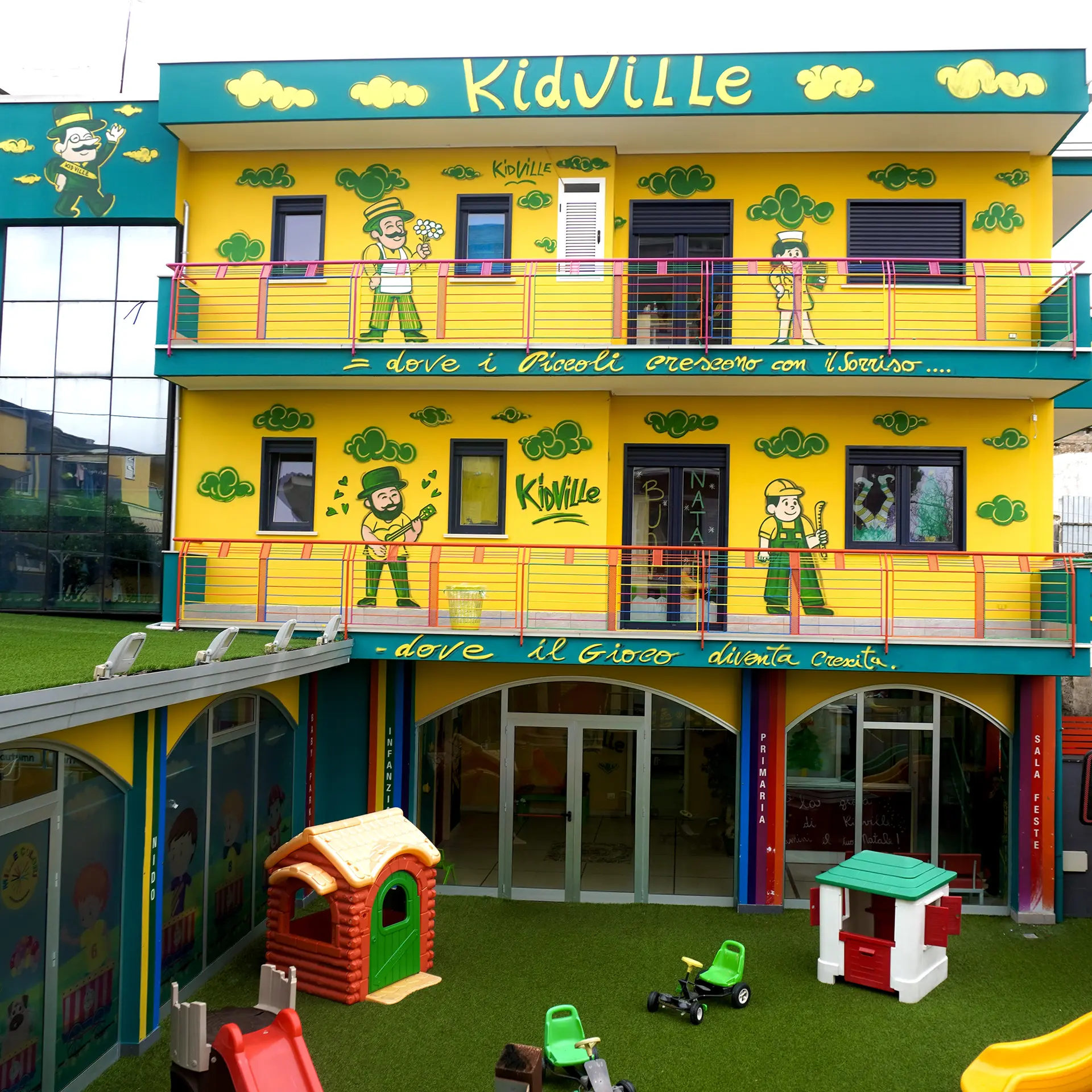 La sede principale dell’Istituto Kidville: un ambiente ampio e strutturato che ospita nido, infanzia e primaria. Gli spazi sono progettati per accompagnare i bambini lungo l’intero percorso educativo, con aule attrezzate, ambienti sicuri e aree pensate per attività creative, motorie e laboratoriali.